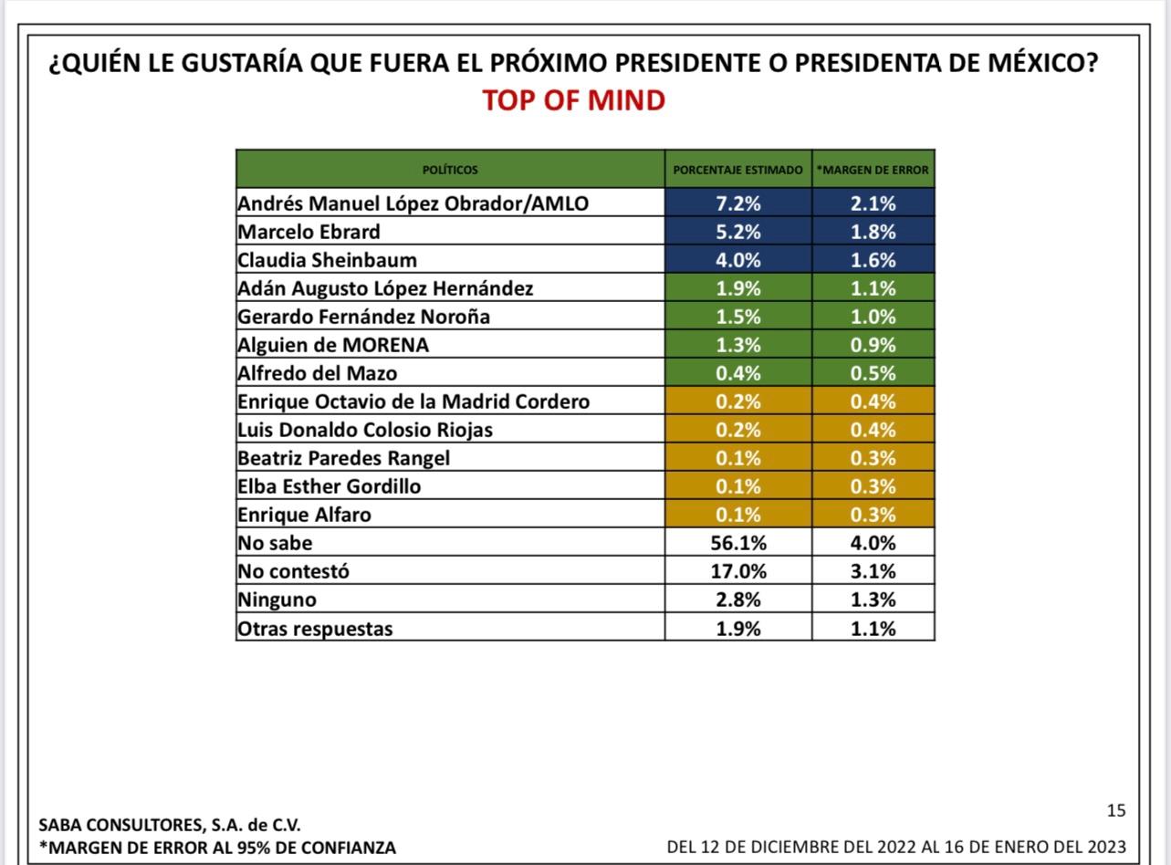 Los primeros resultados que hemos obtenido del Top of Mind, están en la tabla que adjuntamos. Como consecuencia, las próximas cuatro semanas contrastaremos, por Morena-PT-PVEM a Claudia Sheinbaum, Marcelo Ebrard, Adán López y Gerardo Fernández Noroña. Por la alianza PRI-PAN-PRD las opciones serán Beatriz Paredes y Enrique de la Madrid y por MC serán Luis Donaldo Colosio Riojas y Enrique Alfaro.