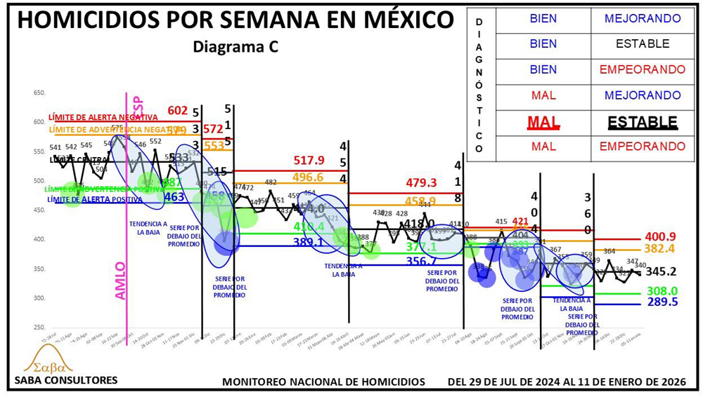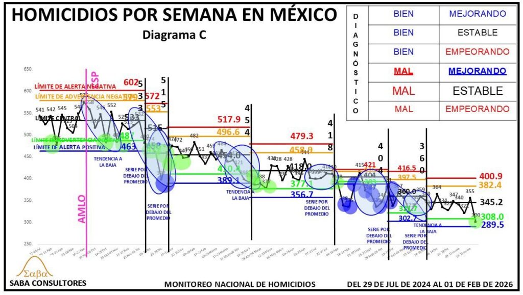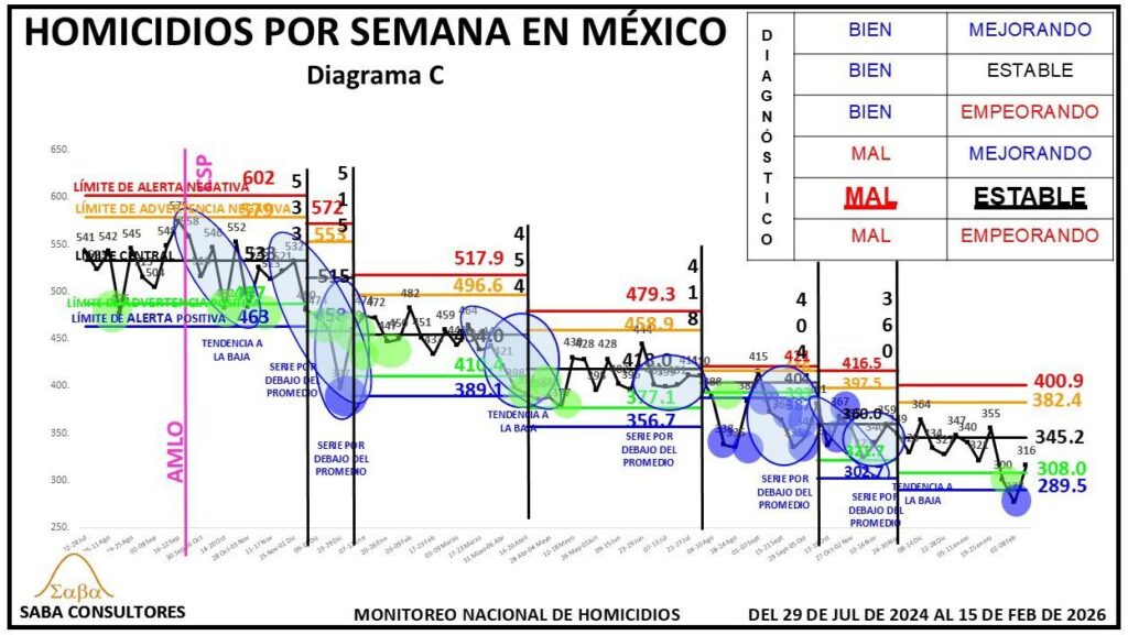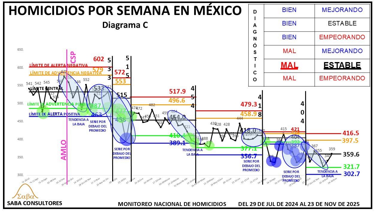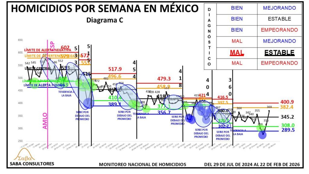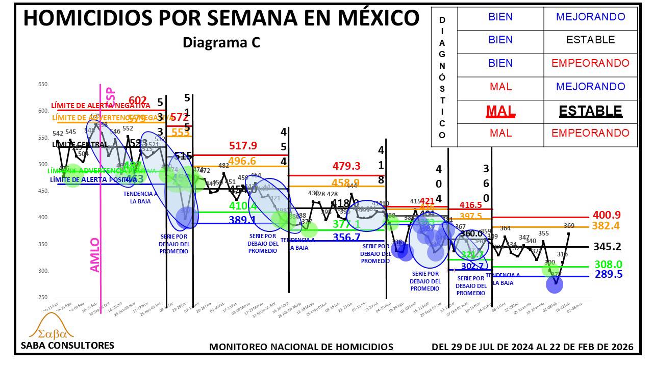 ¿QUÉ HACER?: Dijimos la semana pasada que Omar García Harfuch, el General Ricardo Trevilla y el Almirante Raymundo Morales, deberían enfocarse en romper esta nueva estabilidad, consiguiendo un nuevo descenso en los homicidios, y aunque el diagnóstico es MAL ESTABLE, no podemos dejar de considerar la evolución de las últimas tres semanas (428-402-396), que sugiere que se podría estar gestando una nueva tendencia a la baja. El valor de la próxima semana nos dará más luz al respecto.