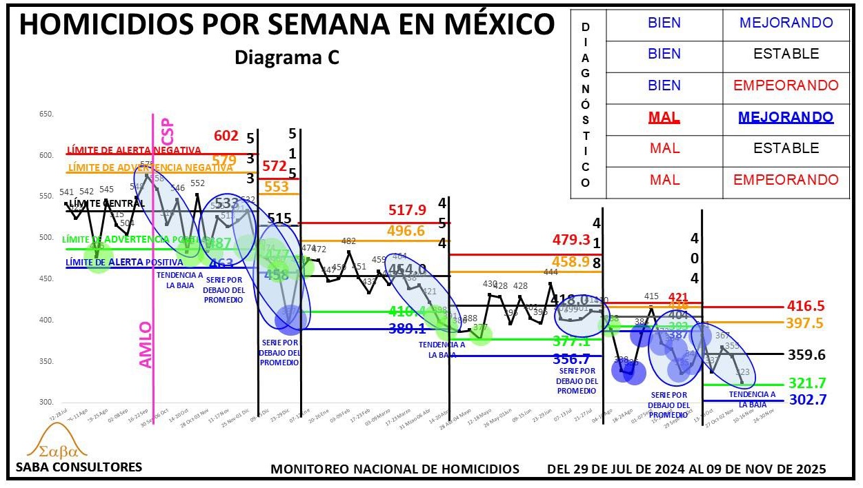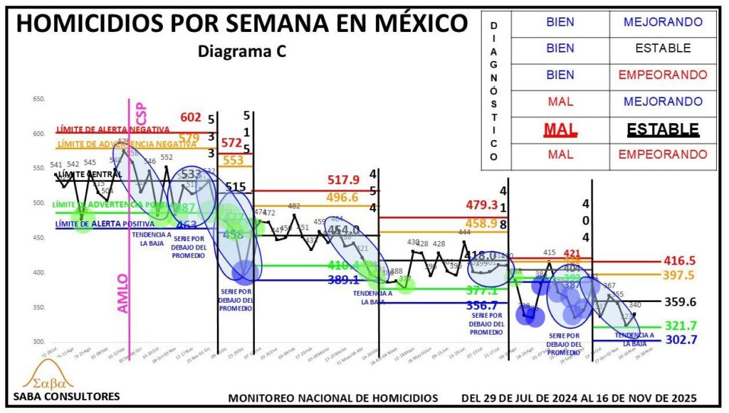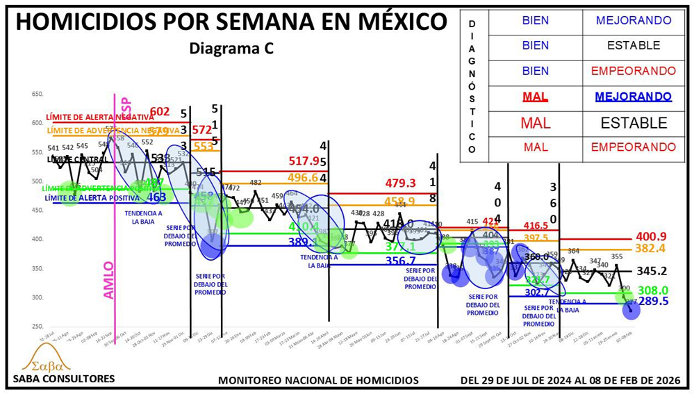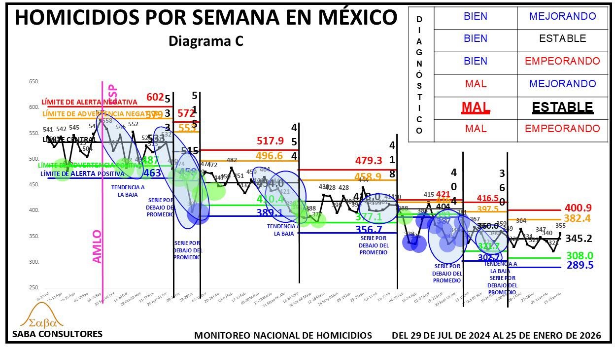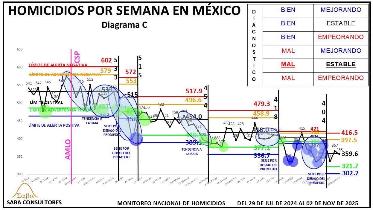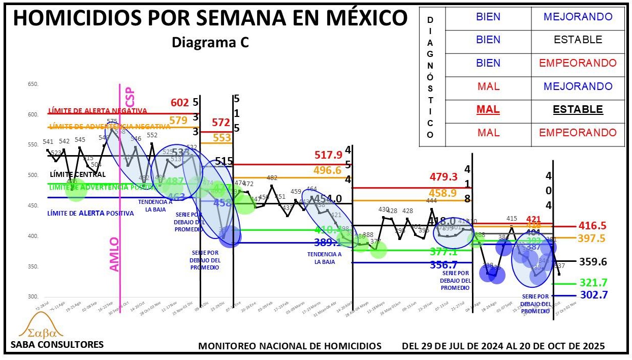 ¿QUÉ HACER?: Dijimos la semana pasada que Omar García Harfuch, el General Ricardo Trevilla y el Almirante Raymundo Morales, deberían enfocarse en romper esta nueva estabilidad, consiguiendo un nuevo descenso en los homicidios, y aunque el diagnóstico es MAL ESTABLE, no podemos dejar de considerar la evolución de las últimas tres semanas (428-402-396), que sugiere que se podría estar gestando una nueva tendencia a la baja. El valor de la próxima semana nos dará más luz al respecto.